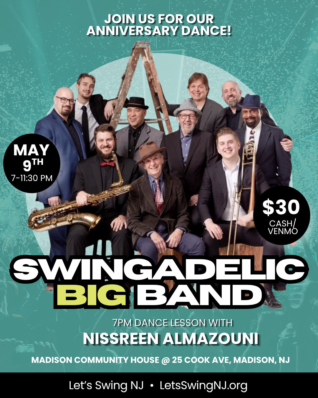 Join us for a special anniversary celebration for Let's Swing NJ featuring the Swingadelic Big Band! It is a rare treat to have a whole big band at our dance, you don't want to miss it! Introductory swing lesson with Nissreen Almazouni from 7:00 to 8:00pm. Then dance with us to Swingadelic Big Band. Music […]